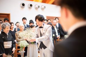 新郎が入場する際に、ゲスト一人一人からバラを受け取り、花束を作り新婦へと受け渡しプロポーズします。